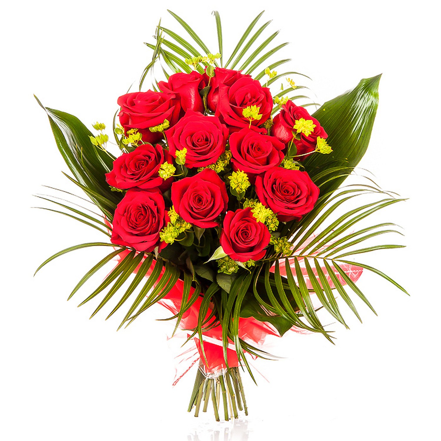 Velká 11 ks růží, 5 ks solidago a dekorativní zeleň (aspidistra, robelini)